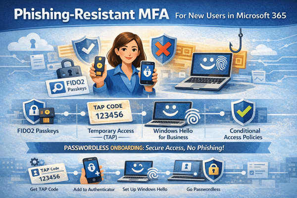 Discover how to onboard new Microsoft 365 users with phishing-resistant multi-factor authentication using FIDO2 passkeys, Windows Hello for Business, Temporary Access Pass (TAP), and Conditional Access. Strengthen security, eliminate password dependency, and reduce credential theft from day one.