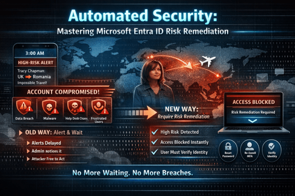 High-risk user alerts at 3 a.m. are exhausting and dangerous. By the time an admin investigates, an attacker may already have full access to email, files, and sensitive data. Microsoft Entra ID changes that with Require Risk Remediation in Conditional Access. Instead of just sending alerts, it automatically blocks compromised accounts and forces secure recovery before access is restored. No delays. No ticket backlog. Just immediate containment and smarter identity protection for Microsoft 365.
