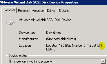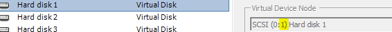 4. Log on to VCenter and edit the VM and see all the disks and note the number after SCSI (. Jot down the number after : which is 1 in this case and matches number in previous step.