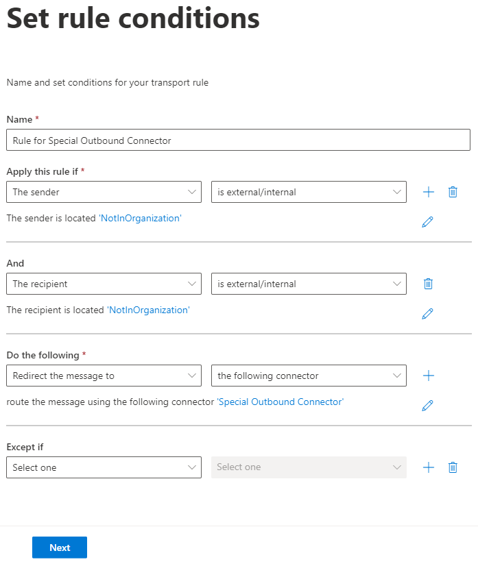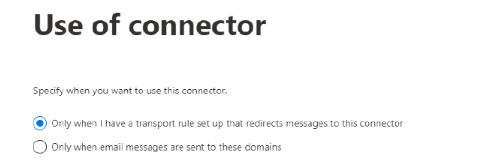 5. Under Use of connector, change this to Only when I have a transport rule set up that redirects messages to this connector and press Next