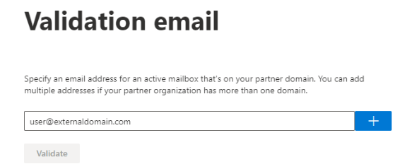 8. Under Validation email, put in an external email (i.e. user@externaldomain.com), click the + button, and press Validate. ***It is OK if the validation fails*** Once it is done validating, whether it passes or fails, click Next. If it failed, you will then click Yes, proceed
