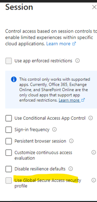 We block access and then under session select “Use global secure access security” and then it will prompt you select a policy. This is to filter web traffic when connected to SSE. So, for e.g. if you don’t want users to access any social networking sites when connected to SSE you can do so by creating security profiles under Global secure access in Entra ID.