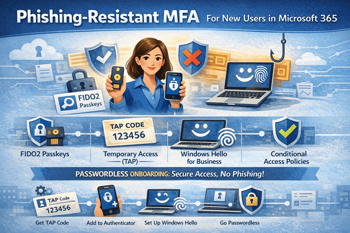 By using FIDO2 passkeys, Windows Hello for Business, Temporary Access Pass (TAP), and Conditional Access policies in Microsoft 365, you can deliver a phishing-resistant login experience from day one.